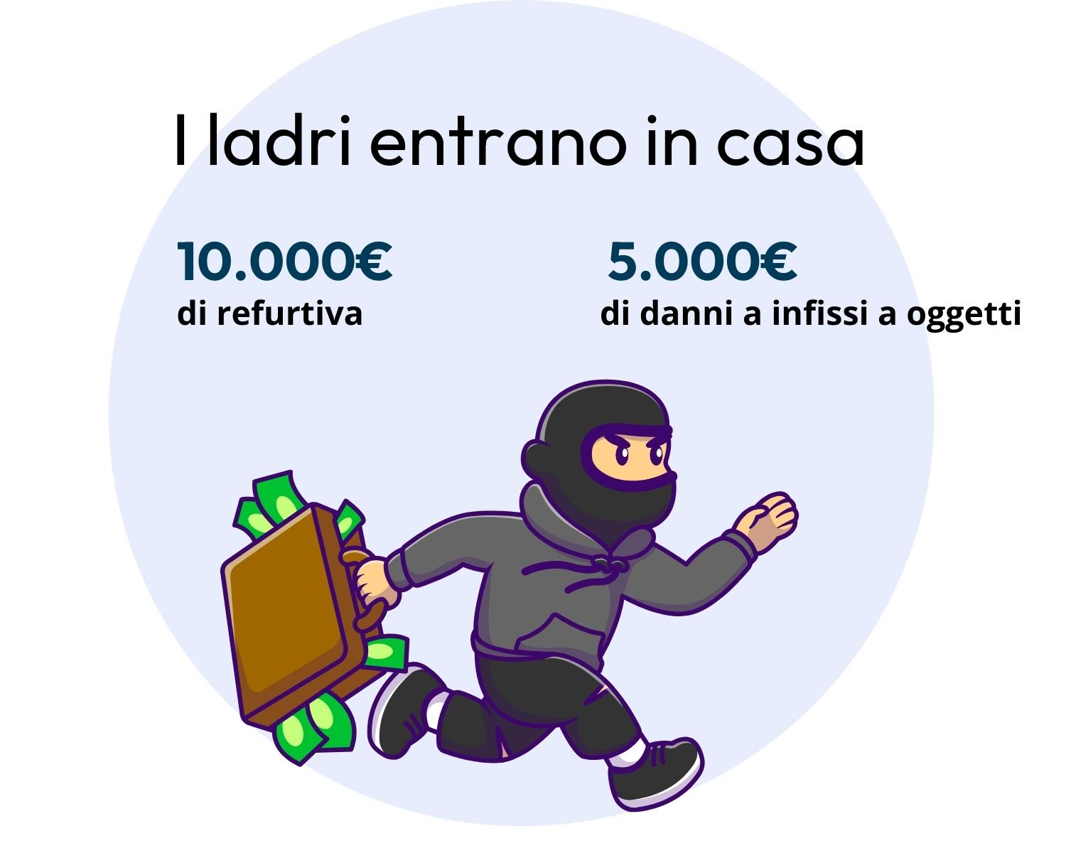 Nel caso in cui un ladro si introduca a casa tua non bisogna solo considerare il valore della refurtiva, che può arrivare facilmente a 10.000€, ma anche i danni provocati a serramenti e mobilio.